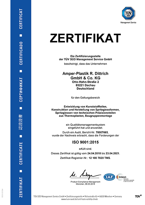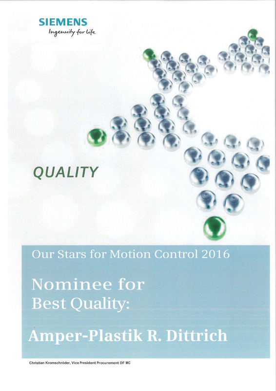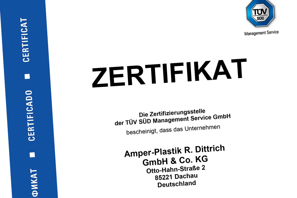 Amper-Plastik produziert in höchster Qualität. Weil wir Kunden nicht nur zufrieden stellen, sondern begeistern wollen. Deshalb können wir auch auf langjährige Kundenbeziehungen und Partnerschaften zurückblicken. Auch dank unseres ausgereiften Qualitätsmanagements, das bereits seit 1997 nach DIN EN ISO 9001 zertifiziert ist. Und wenn wir neben den Zertifizierungen auch noch von Kunden wie Siemens wiederholt als TOP-5 Lieferant in der Kategorie „Quality“ ausgezeichnet werden, macht uns das ein bisschen stolz und ist gleichzeitig ein großer Ansporn für die Zukunft.