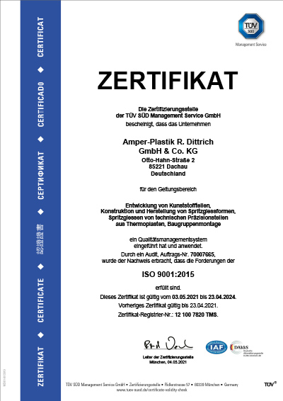 Das Amper-Plastik Team ist als verlässlicher Partner den höchsten Ansprüchen im Bereich der Qualitätssicherung, Kundenzufriedenheit und der organisatorischen Effizienz verpflichtet. Das Team demonstriert diesen Anspruch durch die stringente Umsetzung der Qualitätsmanagementsysteme Norm ISO-9001 zur optimalen Erfüllung der hohen Anforderungen der Kunden, Lieferanten sowie regulierender Behörden auf jeder Prozessebene.