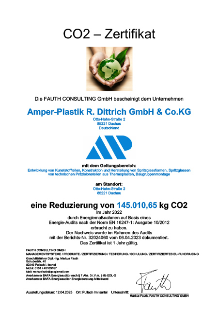 Ein verantwortungsvoller Umgang mit unserer Umwelt ist uns eine Herzensangelegenheit. Aus diesem Grund hat sich Amper-Plastik selbstverpflichtet, jährliche Energiesparmaßnahmen sowie eine CO2-Reduzierung vorzunehmen. Auf Basis eines Energie-Audits nach der Norm EN 16247-1: Ausgabe 10/2012 betrug allein im Jahr 2022 diese Einsparung 145.010,65 kg CO2 im Vergleich zum Vorjahreszeitraum.